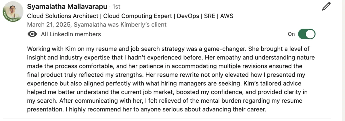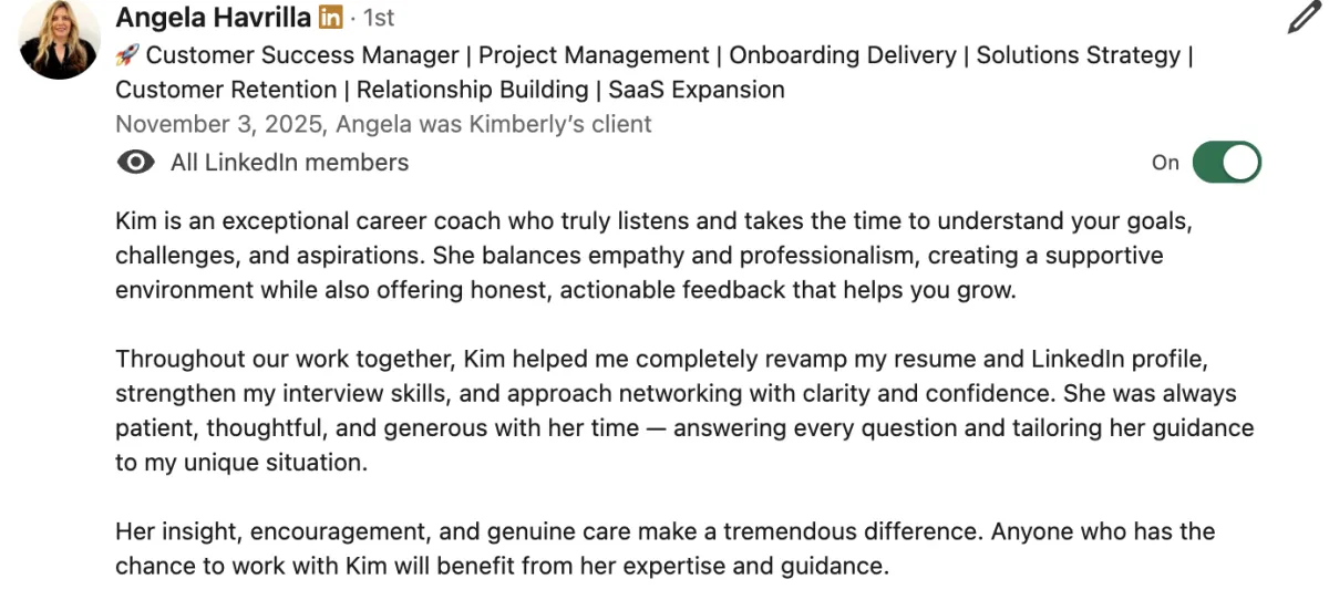 I’m Kim Taynor, and for years I’ve helped senior-level professionals bounce back from layoffs, pivot into more fulfilling roles, and secure meaningful career progress — even in competitive markets.