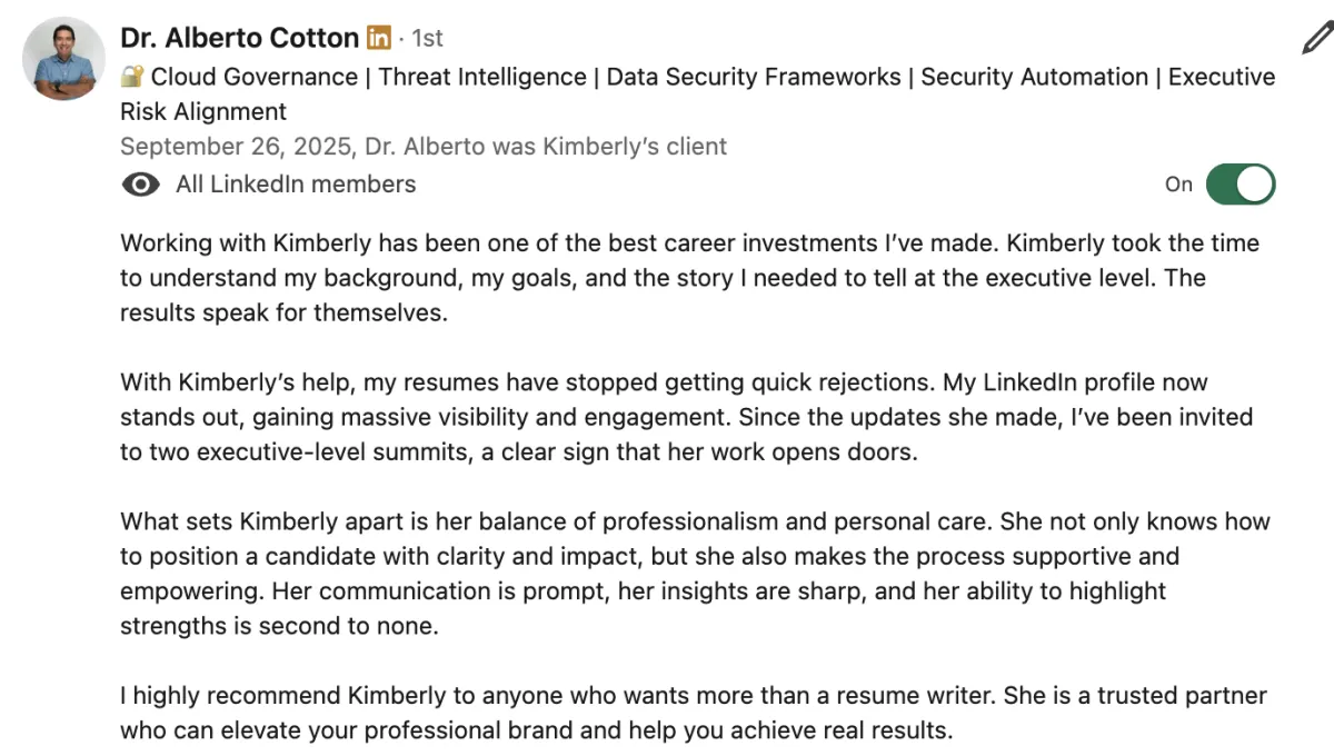 And the results? We achieved faster interviews, stronger offers, and renewed confidence for professionals who once felt stuck and overlooked.